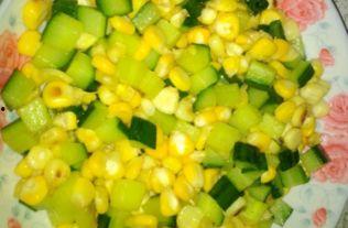 2. 黄瓜炒玉米:将黄瓜切成细丝,玉米粒煮熟备用,热锅凉油,先下黄瓜翻炒,再加入玉米粒快速翻炒,加入适量的盐和鸡精,炒匀即可。